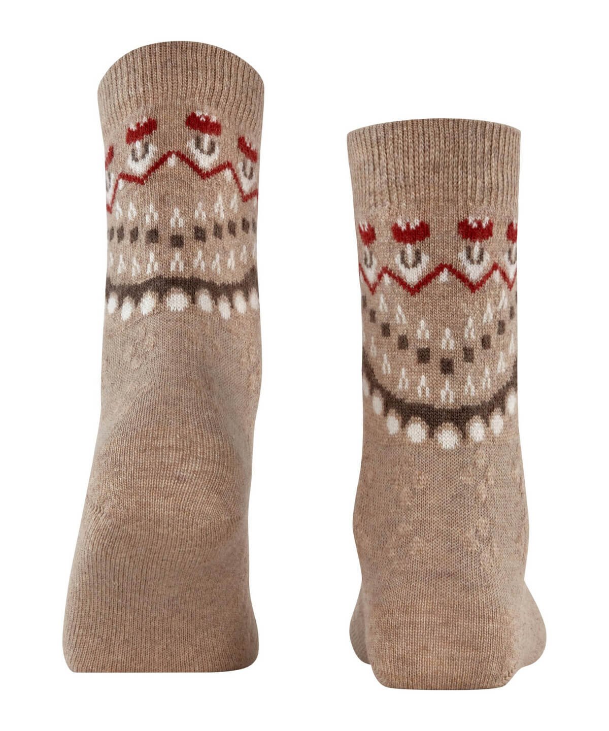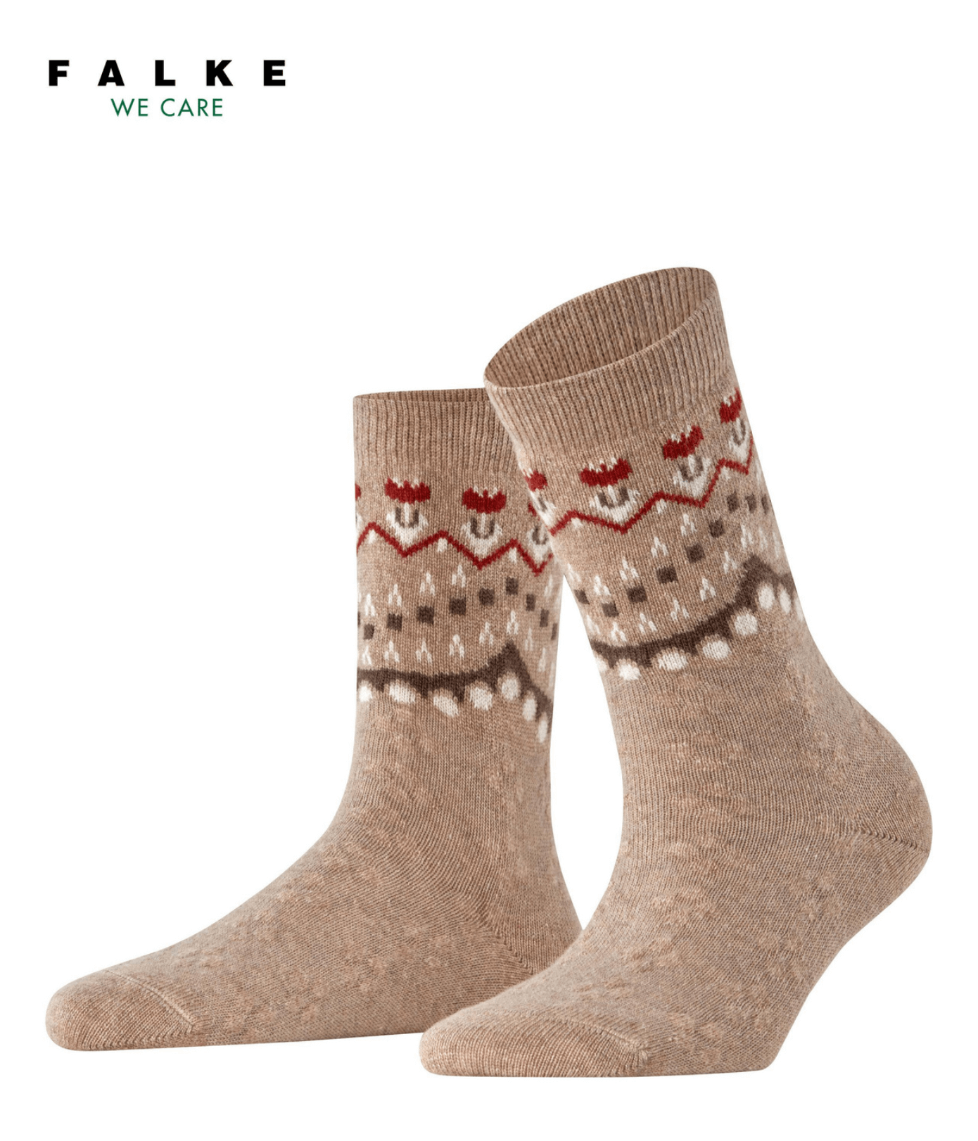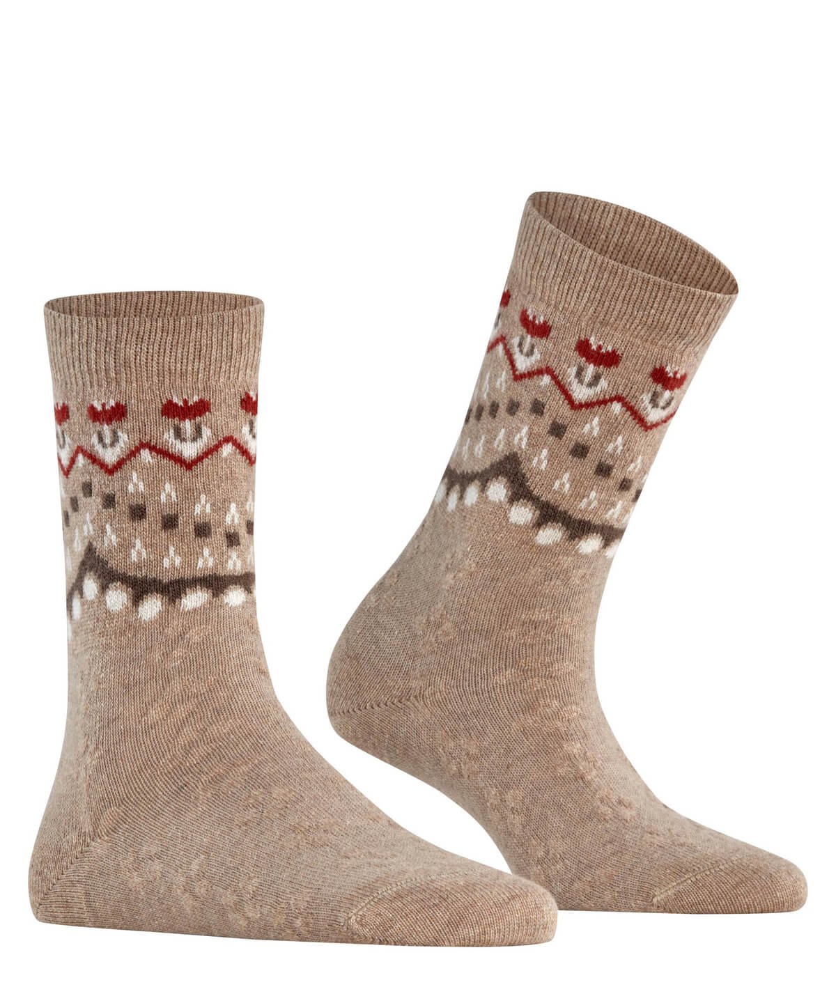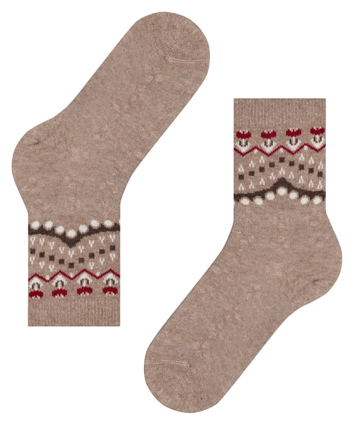 - Popoln zimski dodatek — bogata tkanina, sestavljena iz mešanice merino volne, kašmirja in viskoze, omogoča mehko, toplo ter uravnoteženo nošnjo. Posebno zasnovan dizajn, ki združuje norveški folk vzorec s subtilnimi cvetličnimi poudarki, daje moderen retro pridih. Ojačane cone za boljšo vzdržljivost in prileganje “Falke Perfect Fit” sta garancija za udobno in dolgotrajno uporabo.