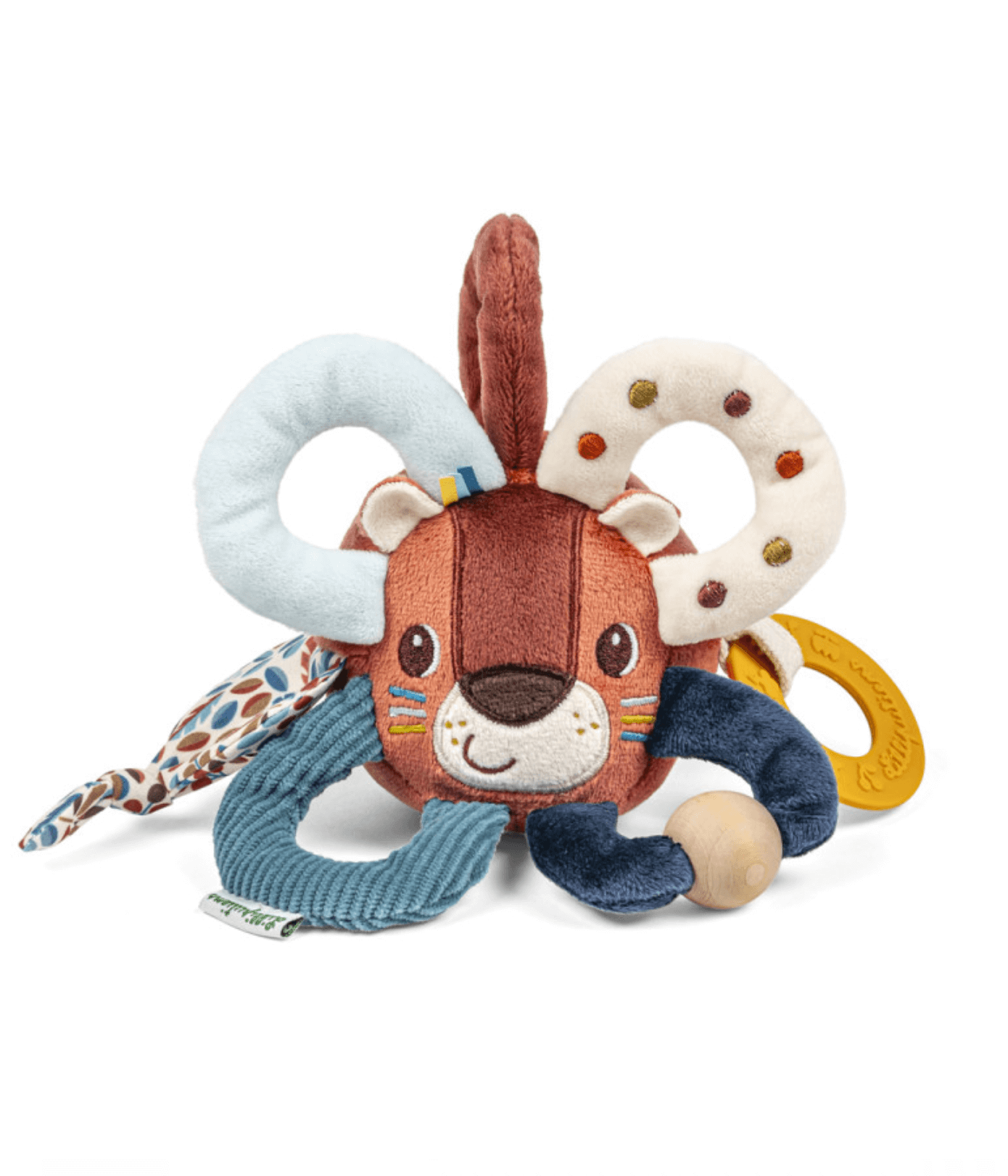 • Obroč iz blaga nežno prebudi čute. Vsak od 5 obročev ponuja drugačen občutek, drugi podaljški pa spodbujajo vid, dotik in sluh. Ta senzorična prebujajoča igrača je v obliki okroglega leva, ki se rad skriva v džungli. Če želite odkriti vse skrivnosti svojega okolja, morate biti radovedni in ne oklevati, da zgrabite, kar vam pride na pot! Da bi to dosegli, je velikost igrače iz blaga in obročev posebej zasnovana za majhne roke. Dojenček zgrabi svoj obroč in odkrije žvenketanje ropotuljice, cviljenje … Za spodbujanje dotika ni nič boljšega kot vezenje, potiski in različni materiali: zelo mehki, žlebljeni ali celo leseni, etikete in trakovi. Uporabljena barvna paleta in kontrasti so prilagojeni vidu malčkov. Majhen dodatek plišaste prebujajoče se igrače je silikonski grizalni obroč: idealen za lajšanje bolečih dlesni dojenčka zaradi dvignjenih vzorcev. Zaradi okrogle oblike in številnih ročajev je ta igrača za aktivnosti enostavna za oprijem, zabava vašega malčka in mu pomaga razvijati čute.