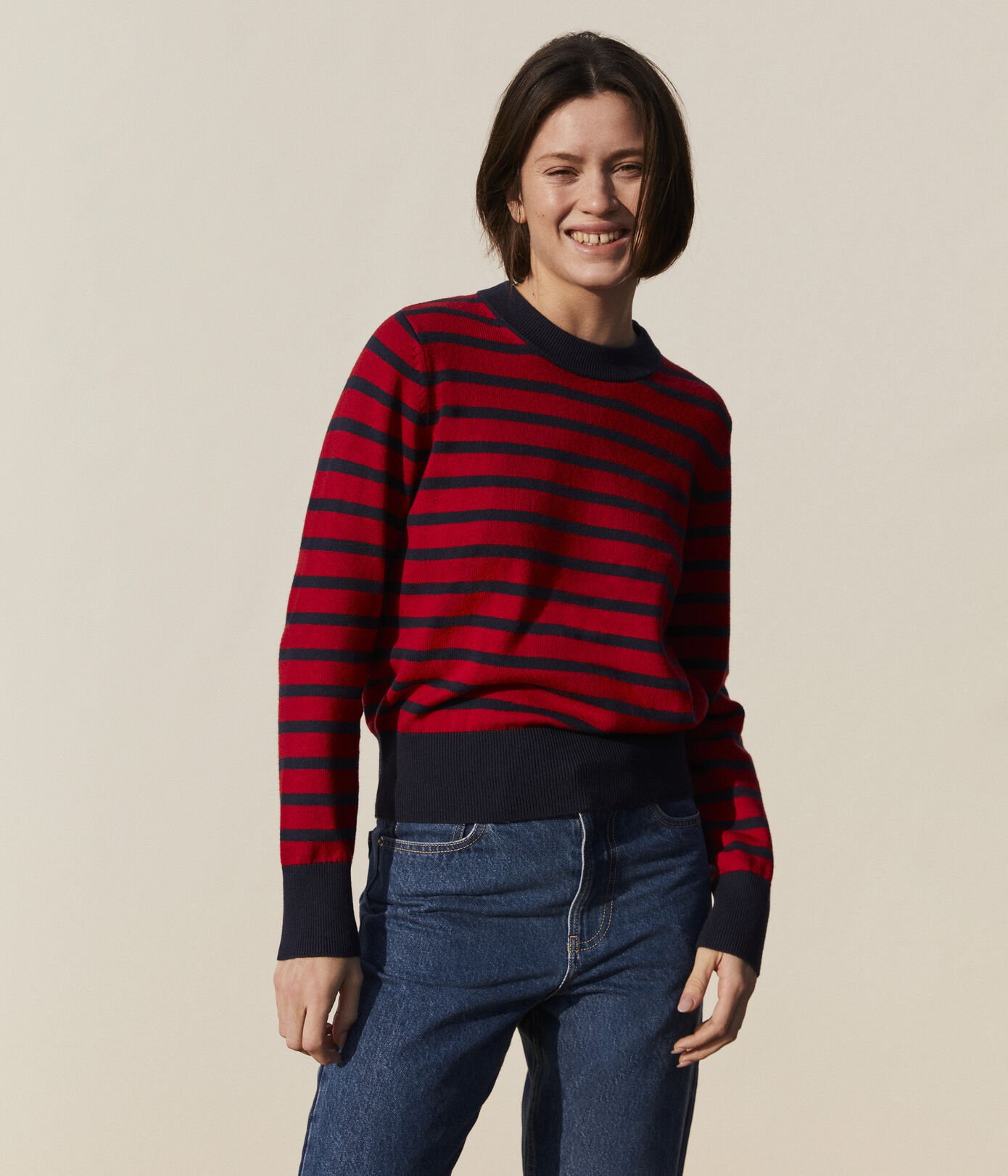 - Ikonični pulover z mornarskimi črtami iz mešanice volne in bombaža.