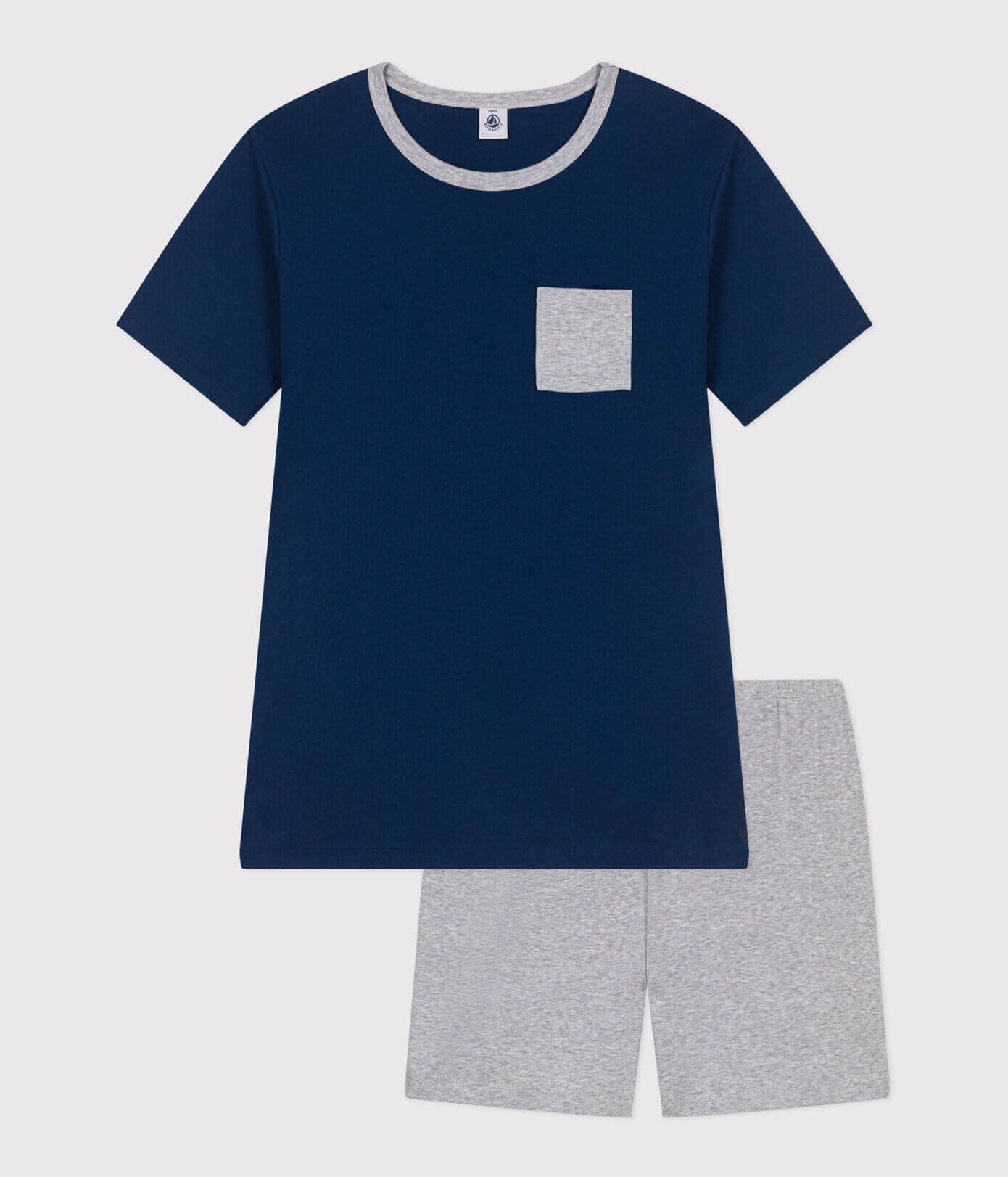 - Kratke hlače imajo elastičen pas in so iz enobarvnega meliranega rebra 1×1. Barva se ponovi na izrezu in na žepu majice.