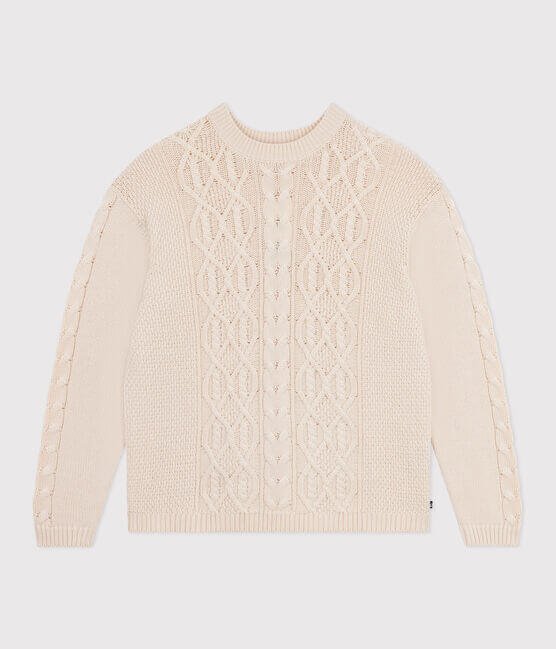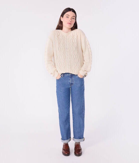 • Pulover s pletenino v slogu Aran iz mešanice volne in bombaža, tako mehak in topel.