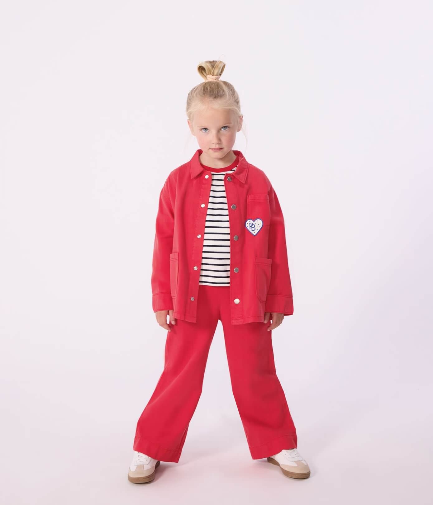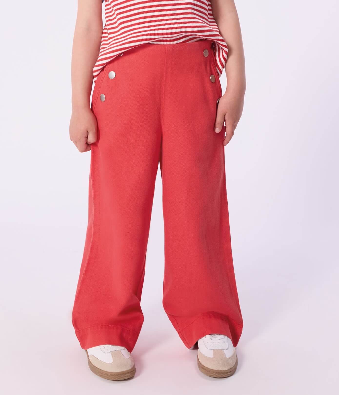 - Dekliške hlače z okrasnimi gumbi, izdelane iz liocelnega/bombažnega keperja, udobne tkanine za nošenje.