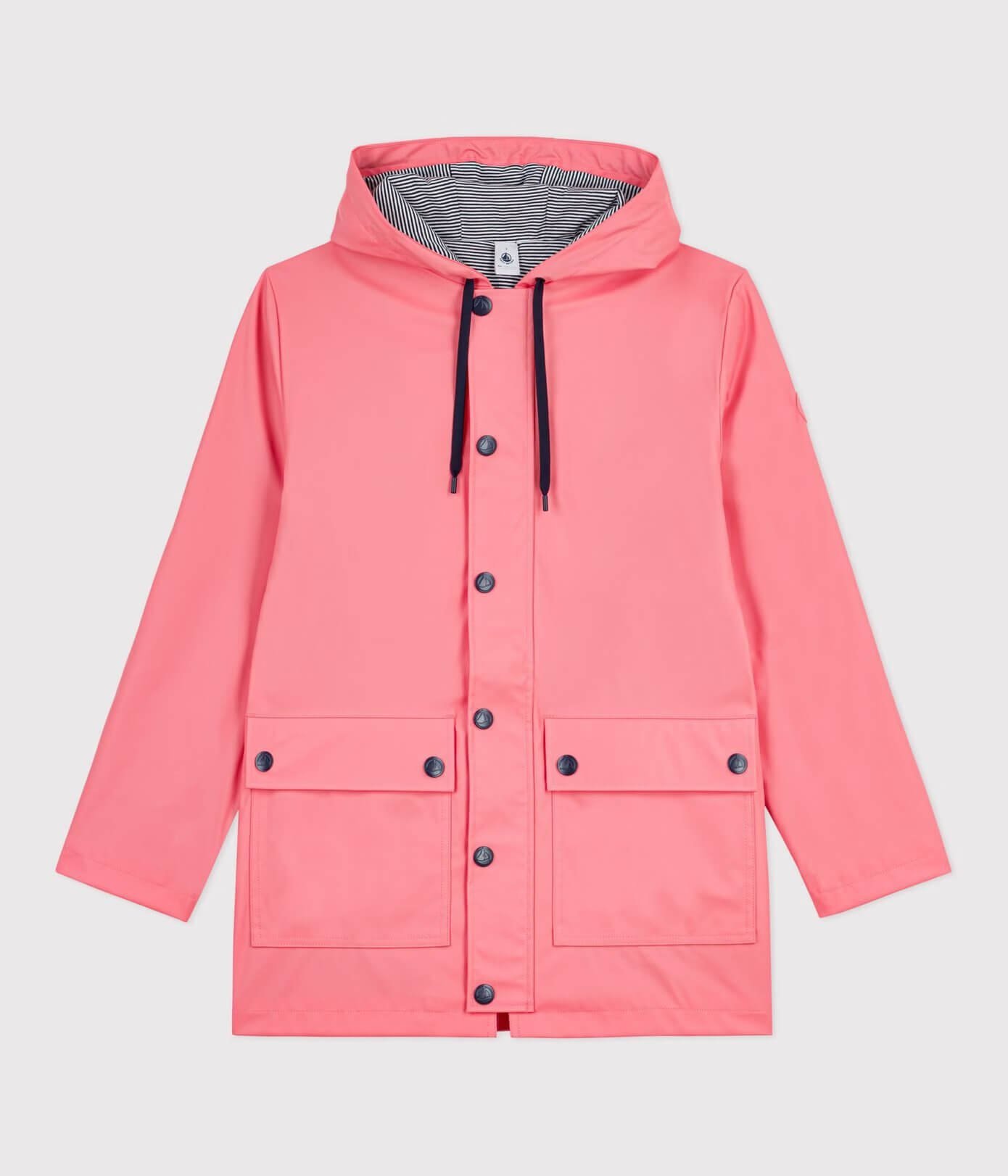 - Raven kroj, mehka, udobna bombažna podloga s tankimi črtami, zapenjanje z zadrgo pod preklopom in izdelana iz prevlečene pletenine za zaščito pred dežjem.