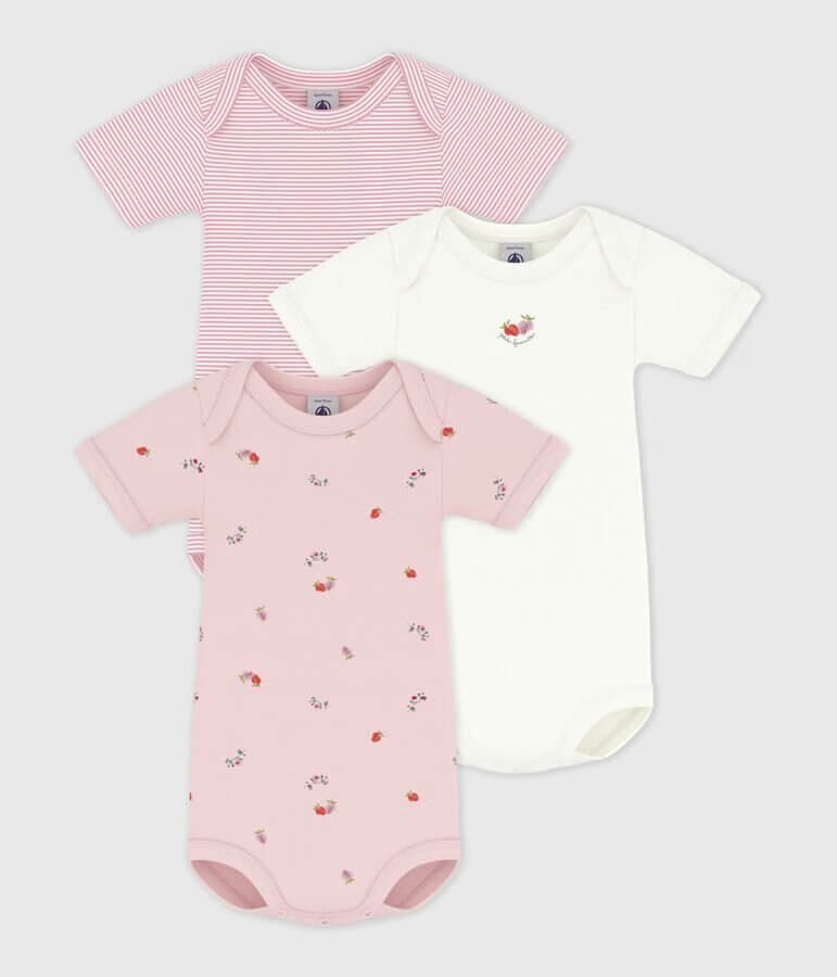 • 3 bodiji s kratkimi rokavi iz ikonične rebraste pletenine Petit Bateau.