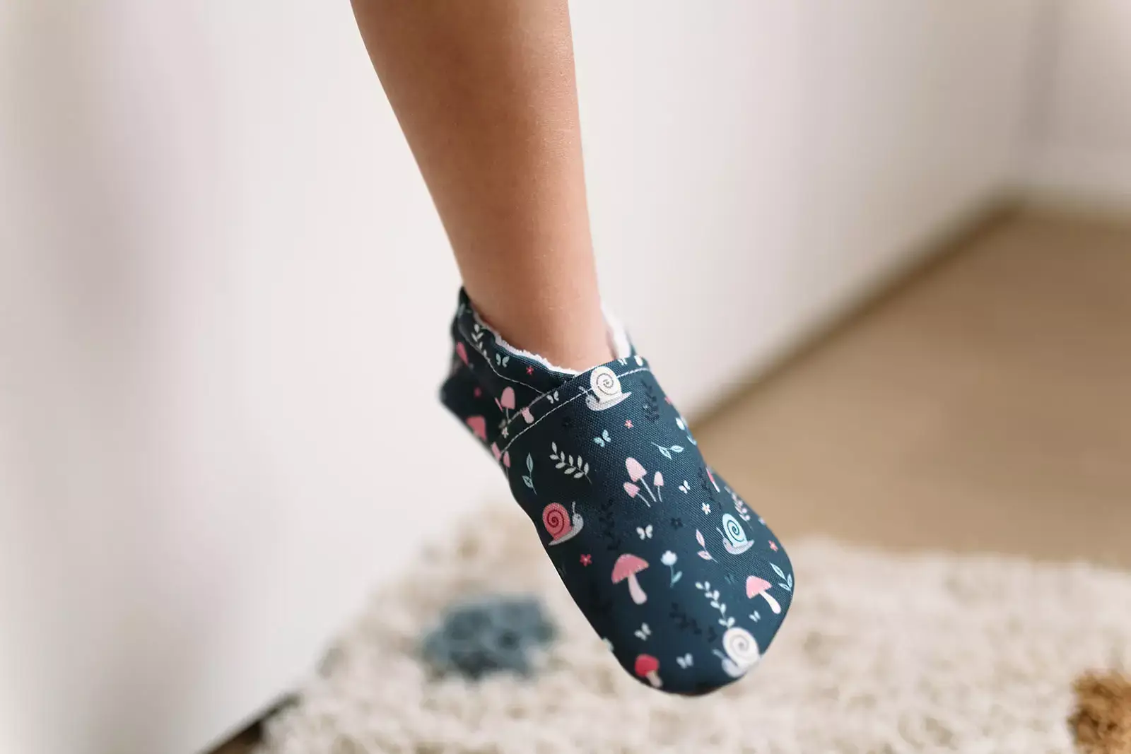 - Mehki otroški copati iz naravnih materialov omogočajo stopalu primerno ravnotežnostno odzivanje, ustrezno čutno izkušnjo in dobre pogoje za razvoj dinamične stabilnosti v gležnjih.