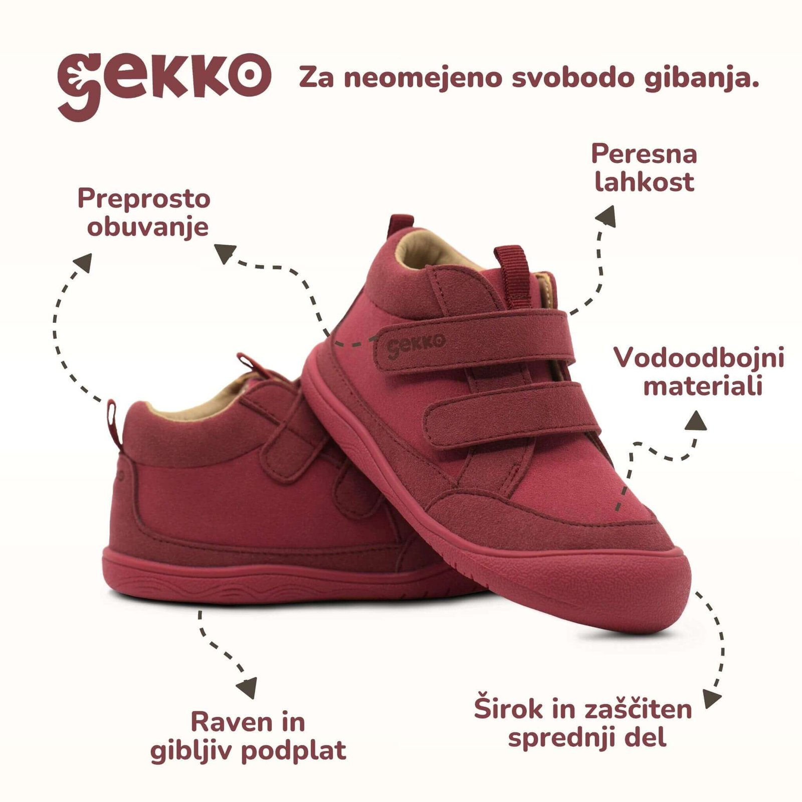 - Gekko Cosy bosonogi čevlji za otroke v jesensko-zimski izvedbi zagotavljajo toploto, zaščito in svobodno gibanje v hladnejših dneh, hkrati pa ohranjajo vse prednosti bosonoge obutve.